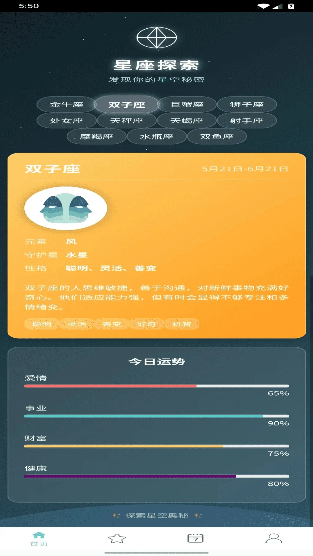 在首页能够查看各个星座的相关介绍,同时也能获取详细的运势情况。