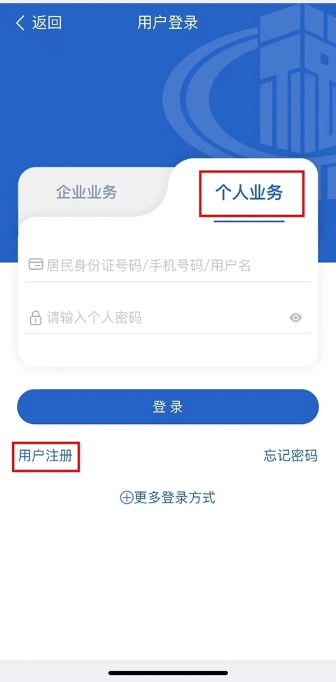 1、启动江苏税务应用,点击界面右下角的“我的”选项,选择“个人业务”入口,填写对应的信息并输入密码后,点击“登录”按钮。