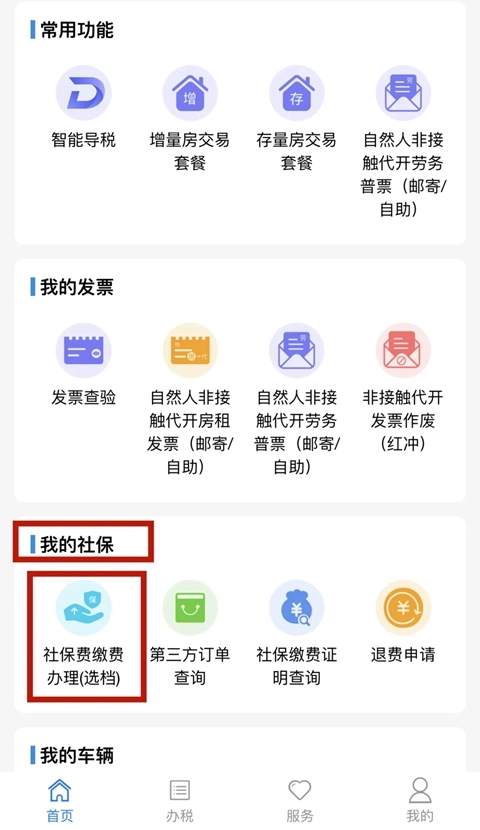 3、登录系统后,点击页面上的“首页”选项,接着在首页中找到“我的社保”入口,然后点击进入“社保费缴费办理(选档)”功能页面。