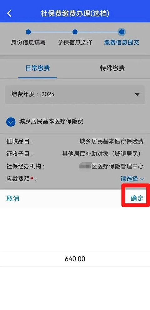 7、点击“应缴费额”右侧的“请选择”下拉按钮,选择对应的缴费金额后,点击“确定”。