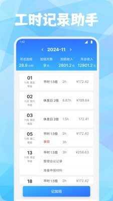 3、多场景适配:支持薪资计算、收入追踪与天气预报,可管理请假,精准核算实际时薪。