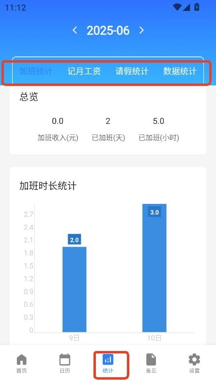 3、借助日历功能查看每月加班与请假的具体情况,以便更好地统筹时间安排。