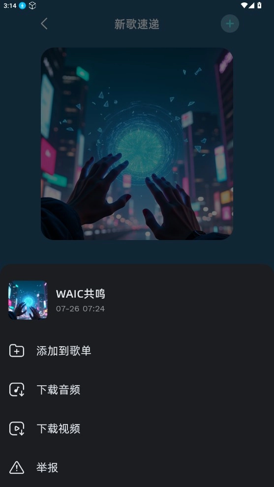 4、播放页面点击右边三个点可添加到歌单、音频等