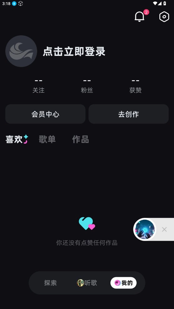 5、我的页面可以查看“喜欢”“歌单”和创作的作品,也能点击创作页进入创作中心
