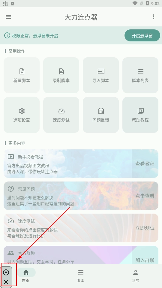 1、首先安装大力连点器软件,然后用微信、QQ或者手机号进行登录,来到软件首页,授予权限。