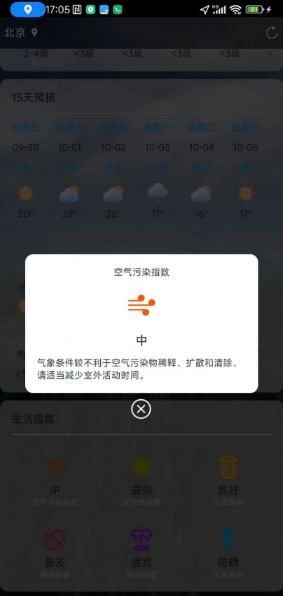 生活指数服务涵盖穿衣、洗车、运动等方面的实用指引,助力用户科学规划日常事务安排。