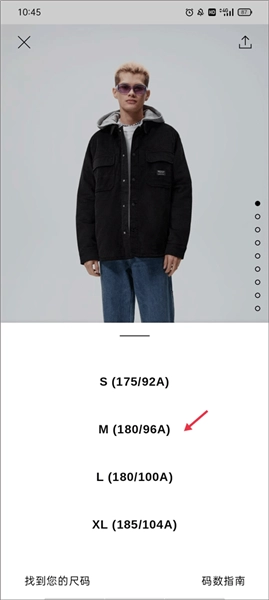 (3)页面弹出了几个衣服的尺寸,根据自身的具体情况来选择合适的衣服尺码,如果你对自己尺码不太了解,还可以点击“码数指南”来帮助你。