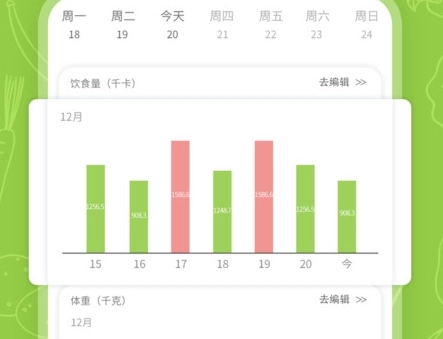 食物日记:界面设计简洁直观,方便用户快速记录每一餐的食物种类与食用分量,系统会自动统计并显示摄入的总热量。