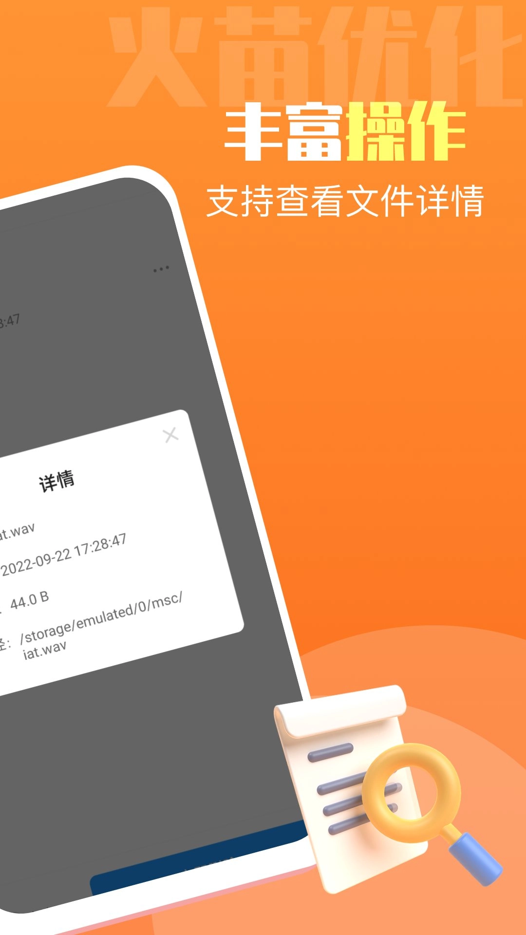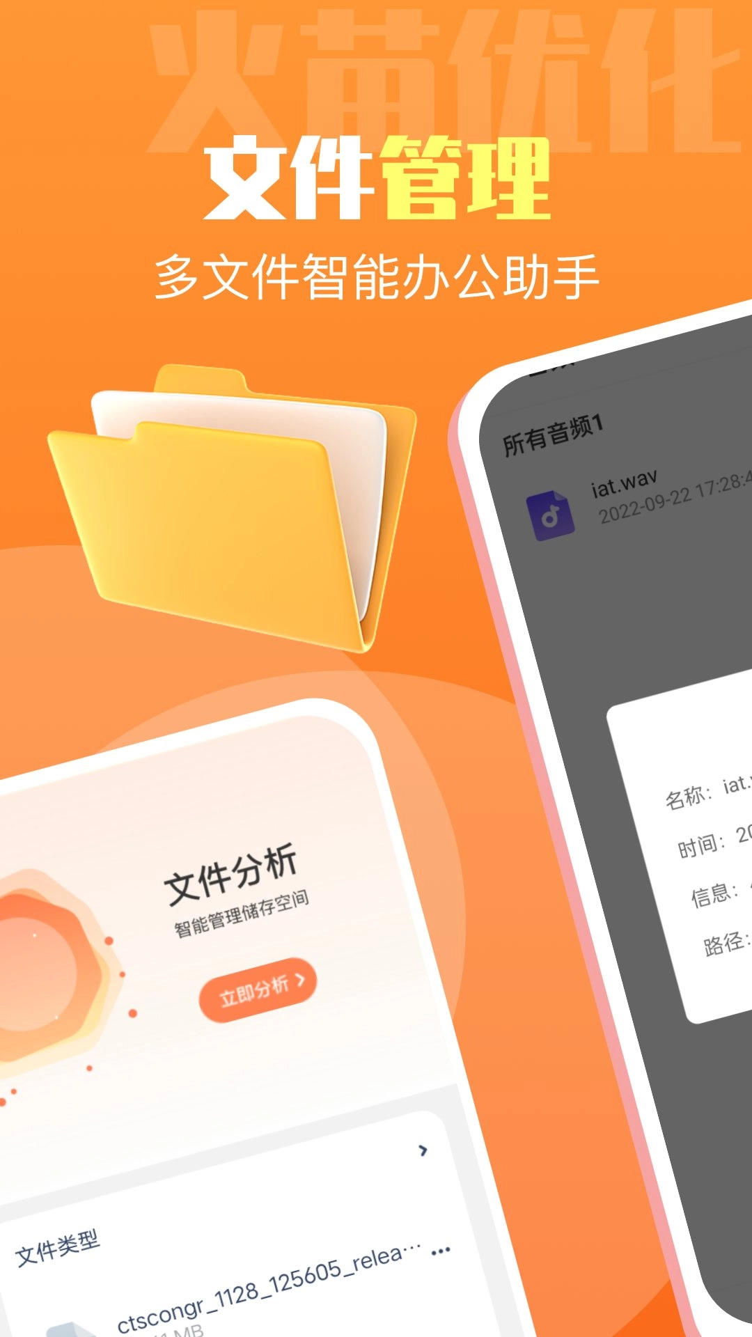 火苗优化大师能助力用户更高效地管理手机内的文件。该软件可依据文件的类型与大小自动分类整理,让用户能轻松找到所需文件。此外,它支持对文件进行重命名、复制、编辑等操作,满足用户对文件的多样化需求。同时,软件还能自动清理重复文件,有效缓解手机内存不足的问题,帮助用户提升手机使用体验。