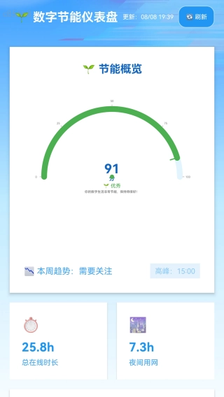 还有一个数字节能仪表盘,会依据用户的手机使用情况,以周为周期为用户进行评分。用户使用手机的时长越少,获得的节能系数就越高,这在一定程度上能激励用户减少手机使用时间。