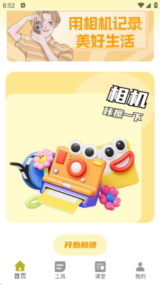 在首页可使用咔擦相机进行拍摄,平台还提供多种不同类型的拍摄服务。