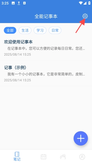 进入【笔记】界面,点击右上角“设置”图标。
