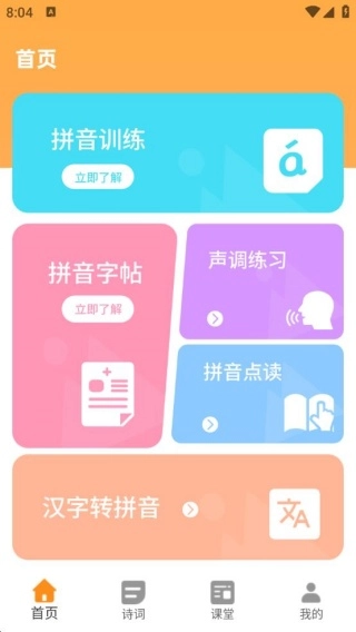 安装软件并进入后,首页提供拼音训练、拼音字帖、声调练习等丰富多样的内容。