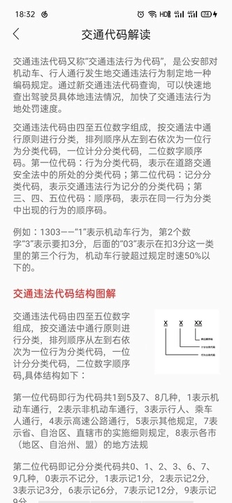 输入交通违法代码,就能快速获取对应的违章行为详情,像行为分类、记分情况以及具体的违规内容都能查到。