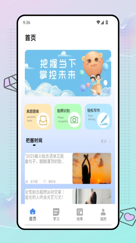 效率页面整合了番茄计划、学习打卡与电子课本功能,支持一键快速浏览。