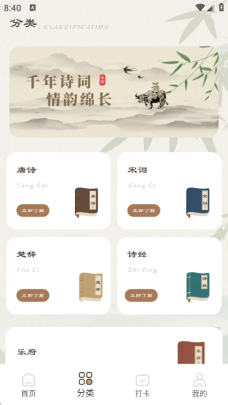 在分类板块中,你可以了解到唐诗、宋词、楚辞、诗经以及乐府等不同类别的内容。