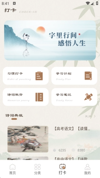 打卡页面里设有习惯打卡、学习计划、诗词默背、学习笔记和诗词典故这些功能板块。