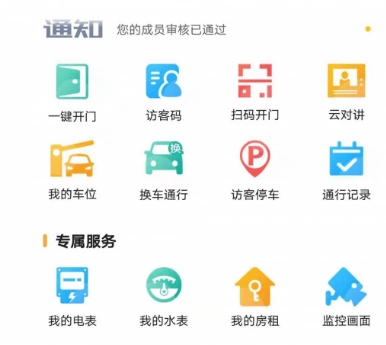 3、主要涵盖的功能包括可视云对讲门铃、手机远程一键开门、扫描二维码开门、访客邀请码开门、人脸识别开门、停车管理、换车通行、访客预约停车、在线账单查询以及便民信息查询。