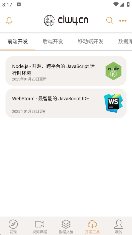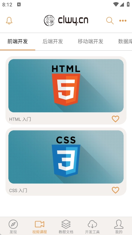 视频课程页面涵盖了前端开发、后端开发、移动端开发、数据库以及服务器运维等课程内容。