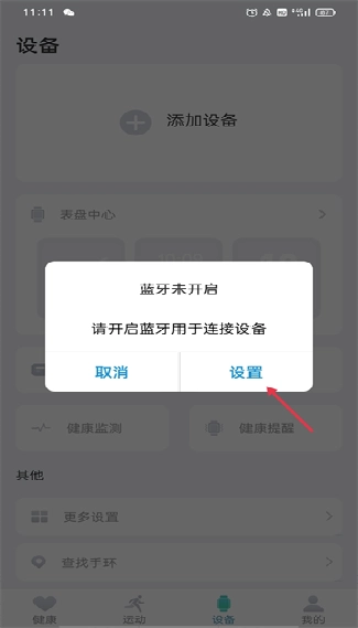在打开软件并登录账号后,会弹出开启蓝牙以连接设备的提示,点击“设置”按钮即可完成操作。