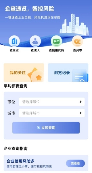 用户通过输入企业名称、注册号或统一社会信用代码,就能获取企业工商信息,涵盖法人代表、成立日期、注册资本、经营范围、登记状态等核心数据,支持模糊搜索和精准查询。2、设有“浏览记录”与“关注企业”两个子功能,前者会自动保存查询历史,后者允许手动添加关注企业,用户可在相应模块查看、管理已浏览或已关注的企业信息,便于二次查阅。3、提供六个企业模板,支持一键将企业信息添加至模板;此外还有“平均薪资查询”工具,用户选定目标职位与城市后,可查询对应岗位的平均薪资水平,为职场决策提供辅助。