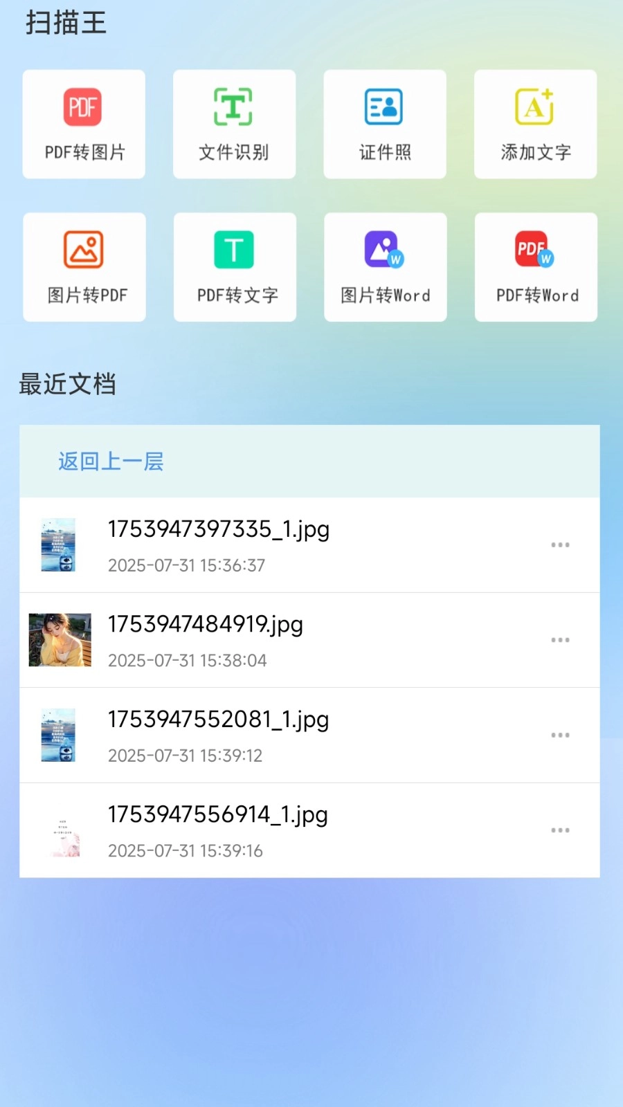 点击下方文件,即可开启文件扫描模式,支持PDF转图片、文字识别以及证件照扫描保存,便于添加文字。