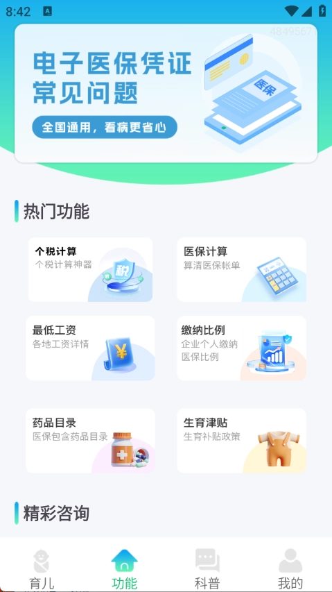 在功能页面里,我们为大家准备了多种热门功能,主要涵盖个税计算、医保计算、最低工资、缴纳比例、药品目录以及生育津贴等。