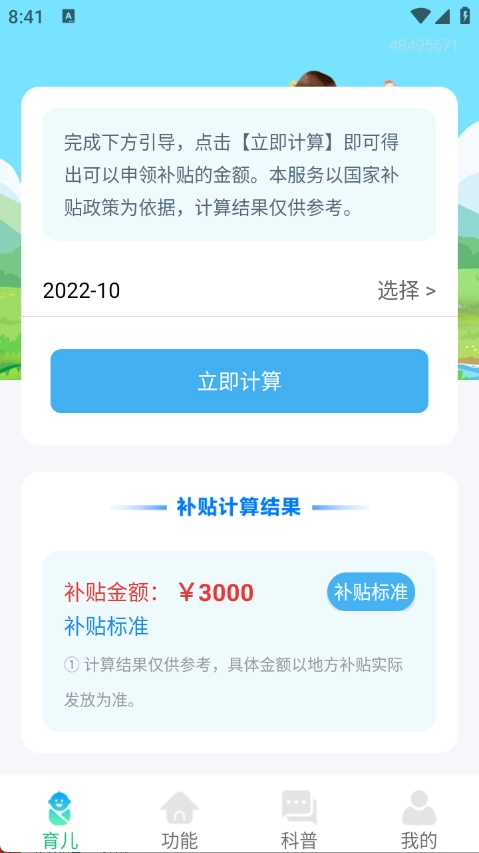 在育儿页面输入孩子的出生日期,点击“立即计算”按钮,就能查询到你的育儿补贴相关信息。