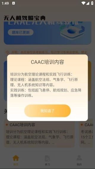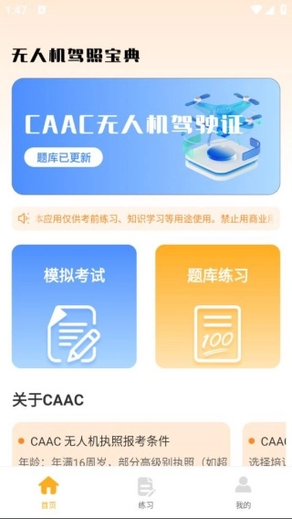软件安装完成后进入平台首页,这里提供CAAC无人机驾驶证的题库资源,您可以直接点击进入进行学习。