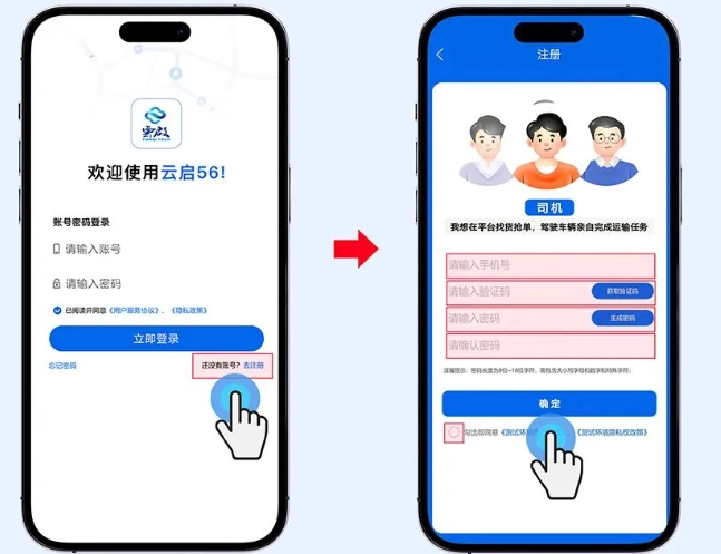 依次填写手机号、验证码、密码、勾选协议,点击确定