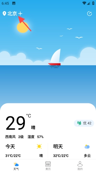 进入【天气】界面后,系统会自动定位并展示当前所在城市的天气状况。