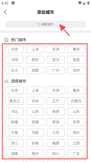 您可以浏览选择热门城市,也可以在搜索框输入关键字来查找想要添加的城市。