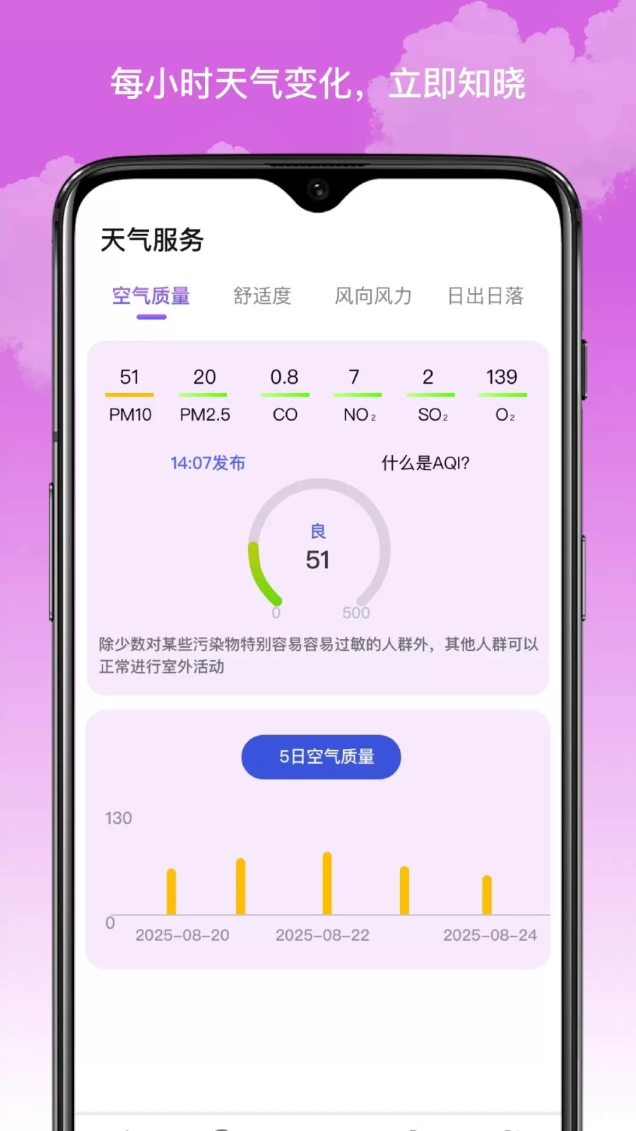 提供实用的生活气象服务,涵盖风向风力、日出日落时间、舒适度等信息查询,为用户日常出行和活动安排提供多维度参考。