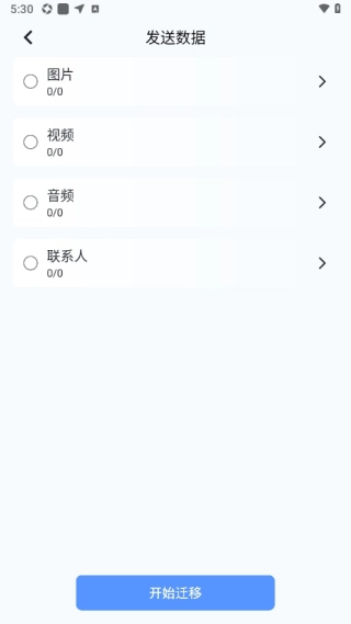 在点击发送数据后,你可以从4个分类中选择旧手机里已有的内容,选好后再次点击发送数据,就能把这些内容传输到新手机上了。