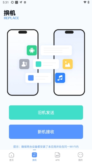 换机功能的使用方法是,新旧手机建立连接后,旧手机选择发送数据,新手机选择接收数据就可以了。