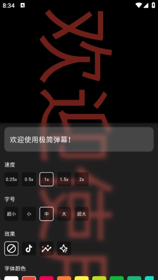 点击笔形按钮就能进入编辑界面,在该界面中可进行文字输入,还能对速度、字号、效果、字体颜色、背景颜色以及字体等参数进行选择与设置。