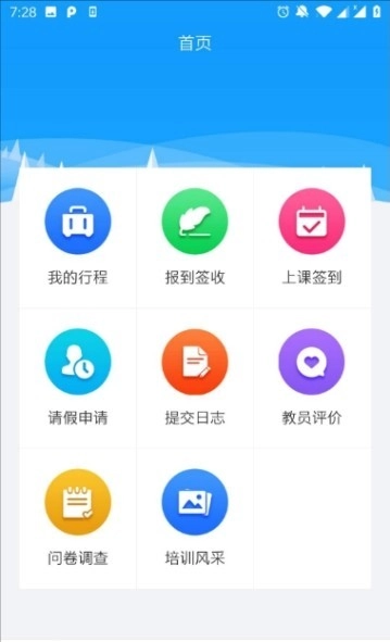 学员端应用服务涵盖:支持查看个人行程安排、完成报到签收流程、进行上课签到操作、对教员开展评价、参与问卷调查、浏览培训风采展示以及提交请假申请等功能。
