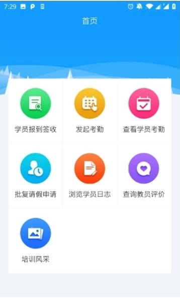 班主任端应用服务:可查看学员报到签收情况,发起考勤管理,进行请假审核,浏览培训风采展示,以及查看教员评价等。