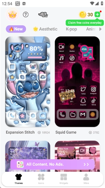 1、在本站完成themepack主题的安装后,启动软件并进入界面,接着选择主题风格,这里有新品、霓虹、美学、粉色、动态资源等众多风格可供挑选;