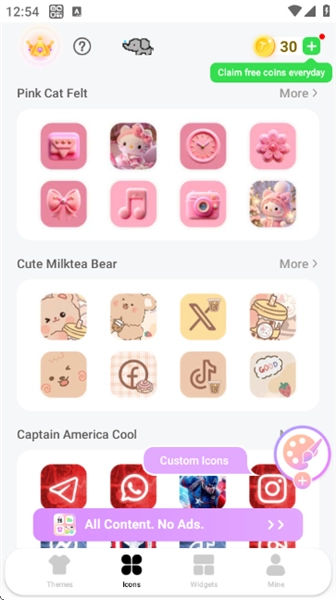 进入“Icons”板块后,你可以挑选Pink Cat Felt、Cute Milktea Bear等不同风格的图标包,还能通过点击“Custom Icons”来进行图标自定义。