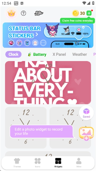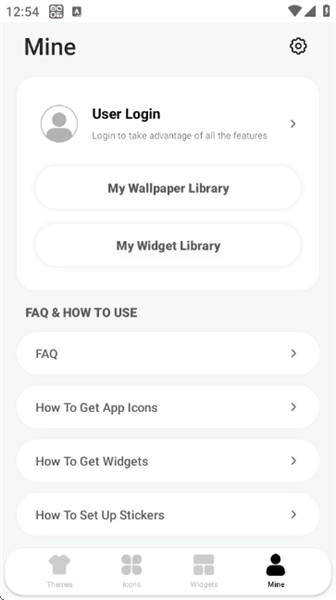 在“Mine”板块中,用户能够登录账号,查看自己的壁纸库和小部件库,同时也可以查看FAQ以及使用教程,例如如何获取应用图标、小部件等内容。
