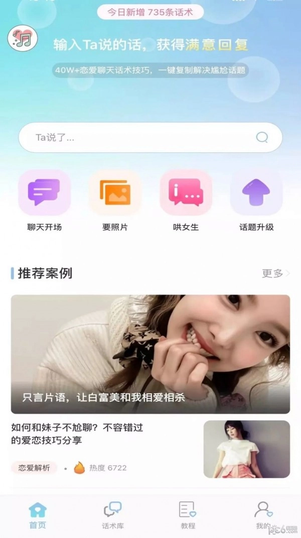 恋爱小帮手教你用更丰富的话术逗对象开心,聊好天的关键是有得力的聊天助手,这样永远不用担心把天聊死。学习各类话术用于聊天互动,深入了解并解读话术内容,让自己成为聊天高手。这里提供的话术都能直接用在互动和甜蜜的恋爱聊天中。