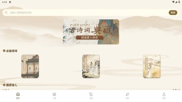 在首页浏览必备诗词、推荐词人等板块的内容,阅读诗词。