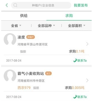 “供需发布”功能支持种植户在平台发布供给信息与联系方式,同时企业也可通过平台发布求购信息及联系方式,以此实现产销对接。