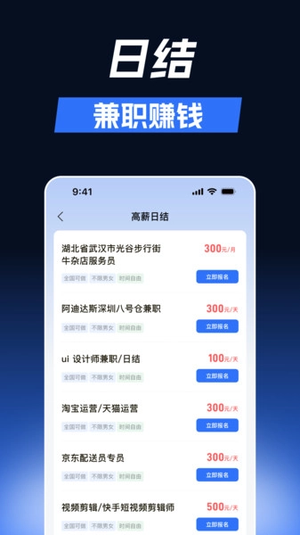 日结薪资:以高薪日结为核心优势,助力用户在完成工作后迅速拿到酬劳,既能缓解资金周转压力,也能有效提升大家参与兼职的热情。