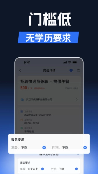信息透明:清晰呈现兼职岗位的各项细节,涵盖薪酬标准、工作时长以及薪资发放的具体安排等,确保用户在充分知晓工作相关信息的基础上做出选择。
