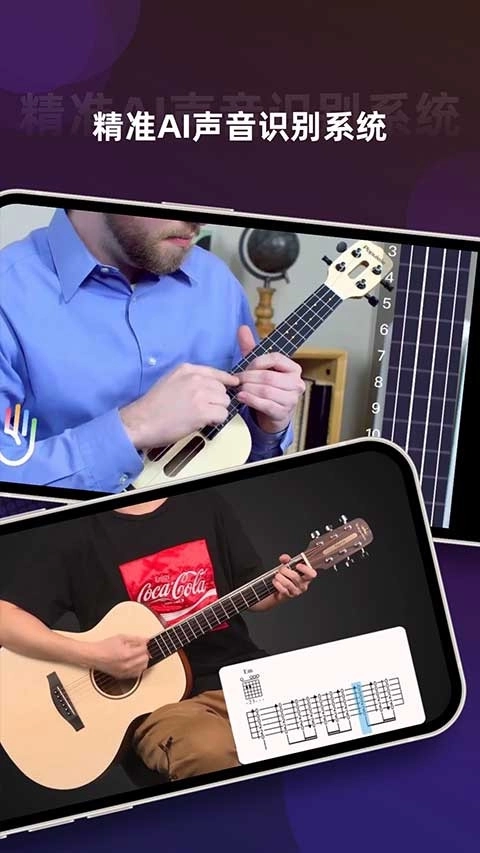判断弹奏正误依旧借助声音识别技术,除了能识别扫弦,还新增了分解、单音指弹、双音指弹等更多尤克里里弹奏技巧的识别功能,确保你在学习过程中的每一步都能及时获得反馈。