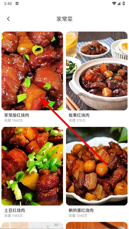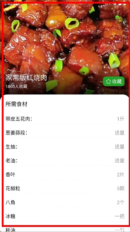 找到家常版红烧肉的菜谱卡片并点击,即可进入该菜谱的详情页面。