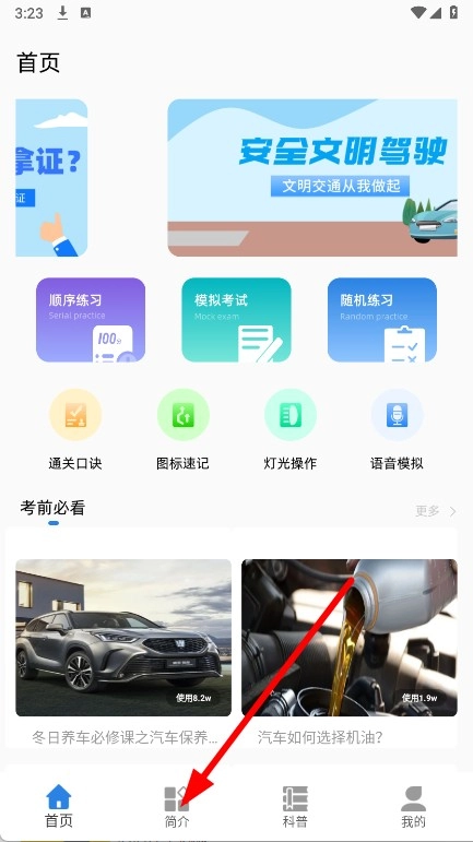 打开考驾照题库后,找到底部导航栏中的“简介”选项并点击,即可进入简介页面。