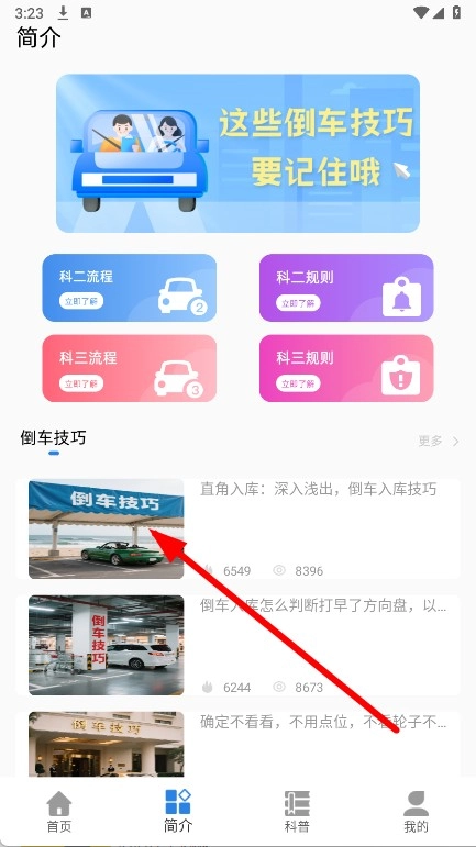 在简介页面的倒车技巧板块里,找到标题是直角入库的内容,点击它对应的视频封面。